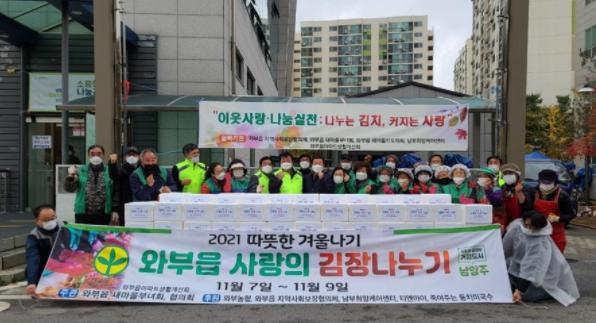 이날 행사를 위해 황완섭 와부읍 지역사회보장협의체 부위원장이 배추 1,000포기, 고려대학교 농장에서 학생들이 공들여 키운 배추 150포기와 무 150개, 와부읍 지역사회보장협의체에서 김장 재료비 300만 원을 후원했으며, 김장 김치는 복지 사각지대에 놓인 장애인, 노인 등 관내 취약계층 200가구에 전달됐다.