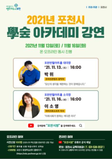 [한국뉴스타임=명기자] 포천시는 시민의 문화적 소양 증진 및 지식함양을 위한 2021년 포천시 學숲아카데미 강연을 평생학습축제와 연계해 오는 13일과 16일에 총 2회 개최한다고 밝혔다.