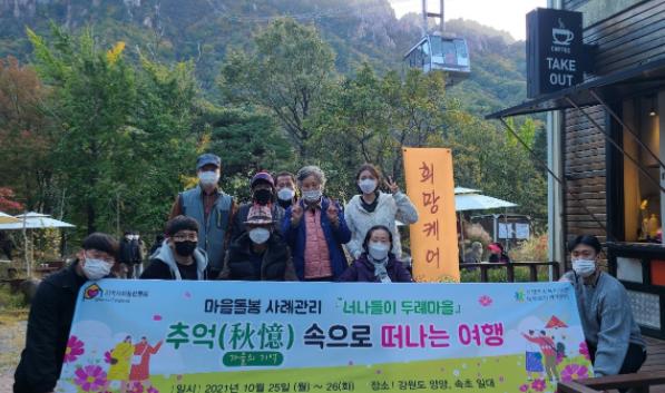 [한국뉴스타임=명기자] 남양주시복지재단 남부희망케어센터는 지난 10월 25일~26일과 11월 8일~9일, 두 번에 걸쳐 어르신 10명과 함께 ‘추억(秋憶) 속으로 떠나는 여행’이라는 주제로 1박 2일 문화 나들이를 실시했다고 밝혔다.