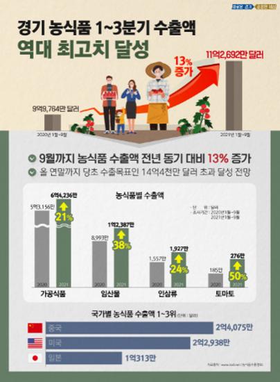 [한국뉴스타임=명기자] 경기도 농식품 수출액이 올해 3분기까지 11억2,692만 달러를 기록하며 전년 같은 기간(9억9,764만 달러) 대비 13% 증가한 것으로 나타났다.