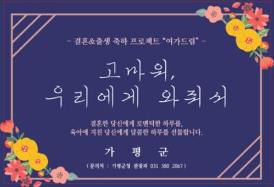 가평군(관광과)에서는 출생·혼인 가구를 대상으로 관내 휴양숙박시설 1박 이용권을 제공하는 “여가드림”사업을 2021.8.4.부터 시행하고 있다.