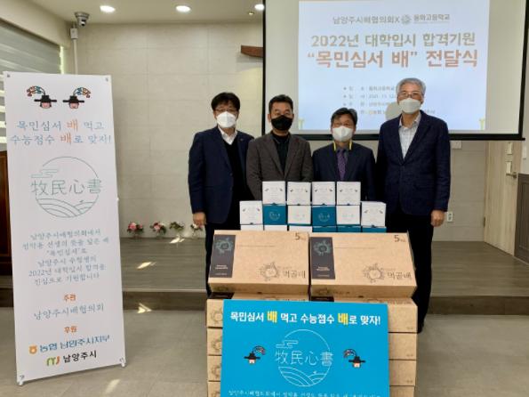 김성복 남양주시배협의회장은 “올해 이례적인 개화기 저온 피해와 ‘과일나무의 코로나19’라고 불리는 과수화상병을 이겨낸 남양주 먹골배가 꽃을 피우고 열매를 맺어 그 어느 해보다 당도가 높은 과일이 됐다. 이러한 어려움을 견뎌낸 점이 코로나19라는 힘든 상황 속에서 열심히 공부한 우리 고3 학생들과 비슷하다.”라며“수험생들이 목민심서 배를 먹고 수능 입시에서 좋은 성과를 얻길 바란다.”라고 격려했다.