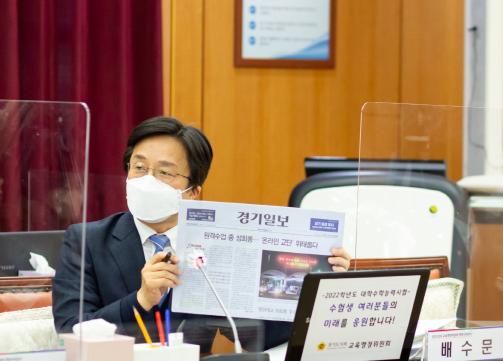 [한국뉴스타임=명기자] 경기도의회 교육행정위원회 배수문 의원(더민주, 과천)은 16일 경기도교육청 남부청사에서 열린 2021년 행정사무감사에서 최근 발생한 원격수업 도중 학생에 의한 성희롱 사건을 언급하며, “최근 들어 교권침해의 유형이 다양해지고 있을 뿐만 아니라 작년부터 이어지고 있는 비대면 수업 장기화로 인해 ‘사이버 교권침해’가 새롭게 등장했다”고 강조했다.