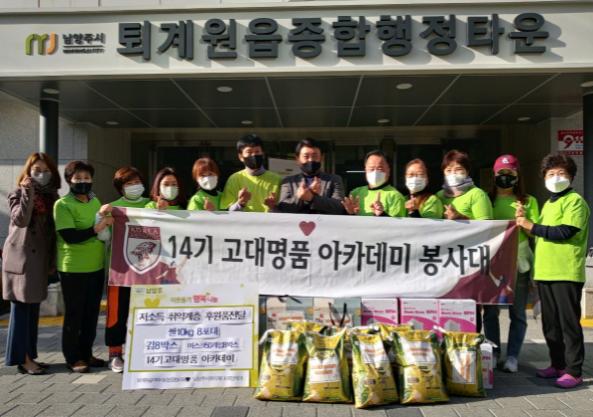 [한국뉴스타임=명기자] 남양주시 퇴계원읍은 고대 명품 아카데미 14기 봉사대가 관내 저소득 가구를 위한 후원 물품을 남양주시복지재단 산하 서부희망케어센터(센터장 대행 김희정)를 통해 기부했다고 밝혔다.