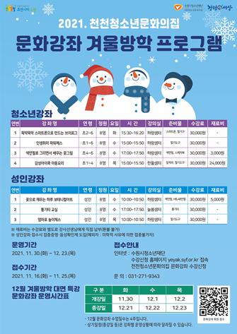 천천청소년문화의집은 장기간 코로나로 지친 청소년과 지역주민들이 건강하고 행복한 일상으로 돌아갈 수 있도록 이번 겨울방학 문화강좌를 대면 특강으로 진행한다고 밝혔다.