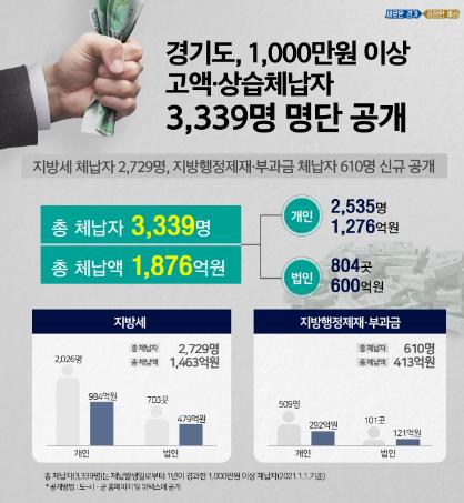 [한국뉴스타임=명기자] 경기도가 1년이 지나도록 1,000만 원 이상의 세금을 내지 않은 지방세, 지방행정제재·부과금 고액·상습 체납자 3,339명의 명단을 17일 경기도 홈페이지와 위택스(지방세 납부 사이트)에 공개했다.