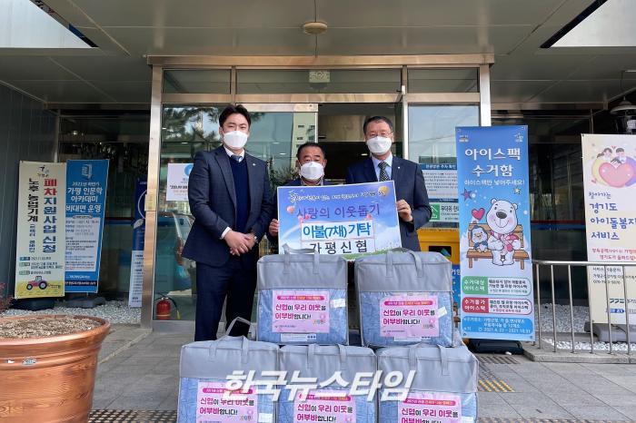 [한국뉴스타임=가평] 가평 신용협동조합(전무 심문섭, 부장 오창호)에서는 16일 가평읍 행정복지센터를 방문하여 관내 취약계층을 위해 이웃돕기 성품 이불 7채를 전달했다.