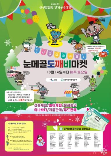 [한국뉴스타임=명기자] 가평군 설악면 눈메골 시장(상인회장 백종민)에서 진행하는 2021 경기발전형 상생 공유마켓 육성사업이 10월 14일부터 지역주민들과 함께 상생과 공유를 주제로 11월 27일까지 매주 토요일(총 7회) 설악눈메골 광장을 중심으로 체험, 놀이, 판매, 공연 등 다양한 행사들이 열리고 있다.