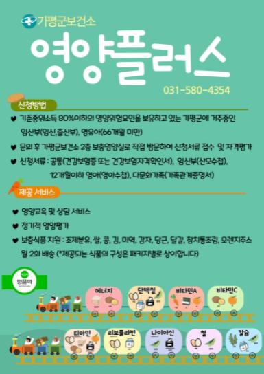 사업 대상은 가평군에 거주하는 임신부, 6개월 이내의 출산부, 66개월 미만의 영유아로 빈혈이나 저체중, 성장부진, 영양불량 중 한 가지 이상의 영양 위험요인이 있고 월평균 가구소득이 기준중위소득의 80% 이하에 해당하여야 한다.