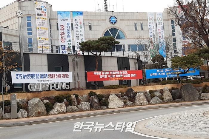 [한국뉴스타임=이명수기자] 최근 언론보도를 통해 논란이 되고있는 경기도 ‘농수산진흥원’(이하 농진원) 이전 대상지역 선정과정 ‘가평→광주’ 조작 정황에 가평군 민간단체들이 ‘조작의혹 규명하라‘며 가평군청 입구 및 주요거리에 현수막을 게시하며 집단행동에 나섰다.