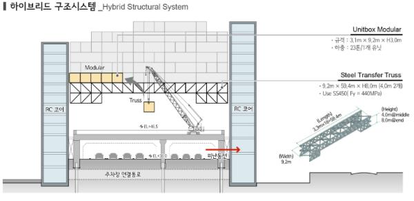 ‘브릿지 시스템’은 도로 위에 일종의 다리를 놓는 방식이다. 도로 양 옆으로 도로와 직접 닿지 않는 대형 기둥(RC코어)을 세우고, 기둥 사이에 상부의 하중을 안정적으로 지지할 수 있는 트러스 구조물을 설치한다. 그 위에는 상대적으로 가벼운 경량 모듈러주택을 지어 구조적 안정성을 확보한다는 계획이다.