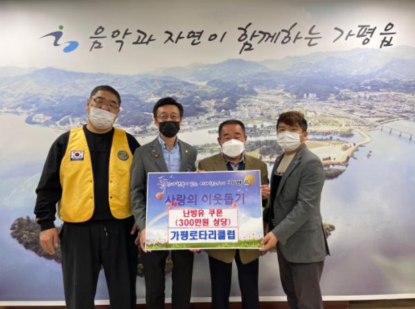 장동선 가평읍장은 “동절기 추위로 인해 어려움을 겪고 있는 이웃을 위해 따뜻한 이웃사랑을 실천해 준 가평로타리클럽에 감사드리며, 앞으로도 우리 지역의 소외된 이웃에게 관심을 가지며 행복한 가평읍을 만들도록 노력하겠다.”고 전했다.