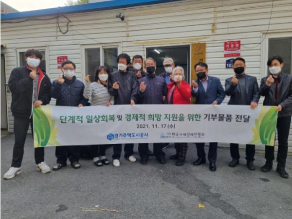[한국뉴스타임=명기자] GH는 지난 17일 한국지체장애인협회 광주시지회를 찾아 지회 회원들의 경제적 자립과 코로나 극복을 위한 물품기부 전달식을 진행했다고 19일 밝혔다.