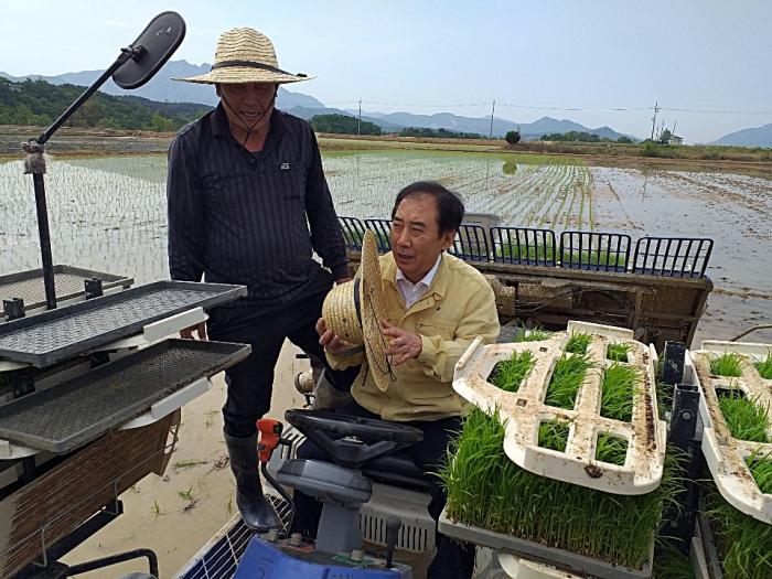 이날 현장을 방문한 박윤국 포천시장은 직접 이앙기를 시승해서 모내기에 동참하고 ‘코로나19’로 어려움을 겪고 있는 영농현장의 현안사항을 청취하고 농민들과 관계자들을 격려했다.
