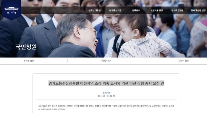 “경기도농수산진흥원 이전지역 조작 의혹 조사와 기관 이전 강행 중지 요청 건” 청와대 국민청원