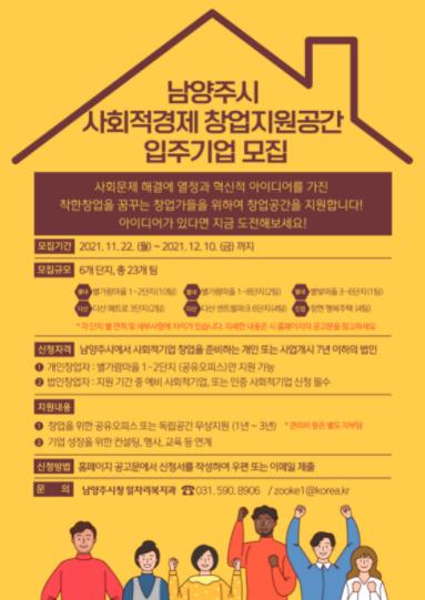 [한국뉴스타임=명기자] 남양주시는 오는 22일부터 다음달 10일까지 「남양주시 사회적경제 창업지원공간」에 입주할 창업팀을 모집한다고 22일 밝혔다. 이번에 모집하는 공간은 별내동, 다산동, 진접읍 등에 소재한 6개 공공주택 단지 내 사회적기업 공간 958㎡으로 △개방형 사무공간(공유 오피스) 10팀, △개별 사무실 13팀 등 총 23개 기업을 모집한다.