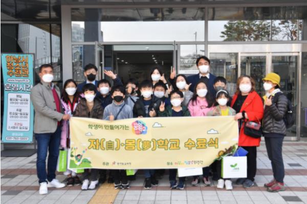 이어 하남시청소년수련관으로 이동해 ‘하남자몽학교 수료식’에 참석해 청소년들의 학교 밖 활동을 응원했다. 하남자몽학교는 지난 5월부터 초등학생들이 참여해 황산숲길과 망월천을 탐방하며 새·풀·꽃·나무·곤충들을 관찰하는 활동을 했다. 관찰한 여러 생태 친구들을 생태지도에 담아 직접 그려낸 것이다. 이를 통해 하남의 소중한 자연환경을 자세히 볼 수 있는 기회가 됐다.