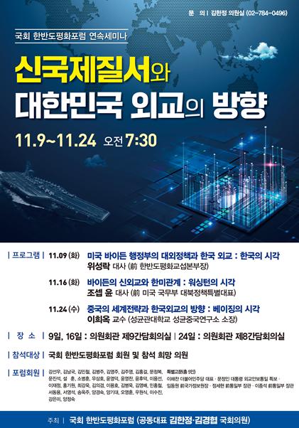 [한국뉴스타임=명기자] 국회 한반도평화포럼(공동대표: 김한정, 김경협 의원)은 '신국제질서와 대한민국 외교의 방향'의 세 번째 세미나를 11월 24일 오전 7시 30분 국회의원회관 제8간담회의실에서 개최한다고 밝혔다.