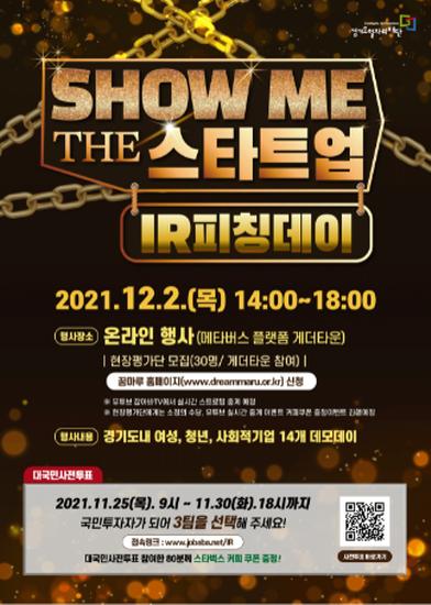 [한국뉴스타임=명기자] 경기도일자리재단은 투자전문가뿐만 아니라 일반 국민들도 참여해 유망한 새싹기업(스타트업)을 뽑는 투자유치 발표 행사 ‘쇼미 더 스타트업 IR(투자유치)피칭데이’를 진행한다고 25일 밝혔다.
