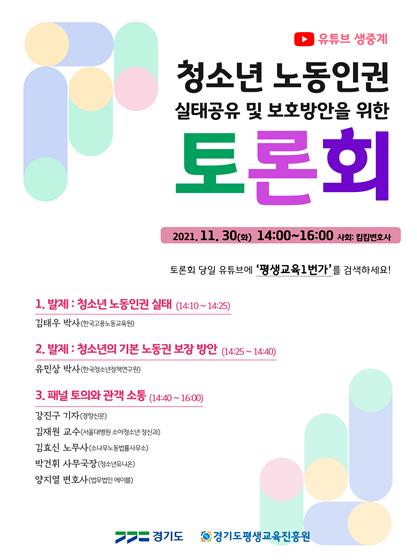[한국뉴스타임=명기자] 경기도평생교육진흥원이 11월 30일 오후 2시 ‘청소년 노동인권 실태공유 및 보호방안을 위한 토론회’를 온라인 비대면 방식으로 개최한다.