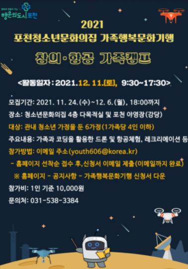 [한국뉴스타임=명기자] 포천청소년문화의집은 관내 청소년 자녀를 둔 가정을 대상으로 12월 6일까지 가족행복문화기행 ‘창의·항공 가족캠프’ 참가 가정을 모집한다.