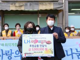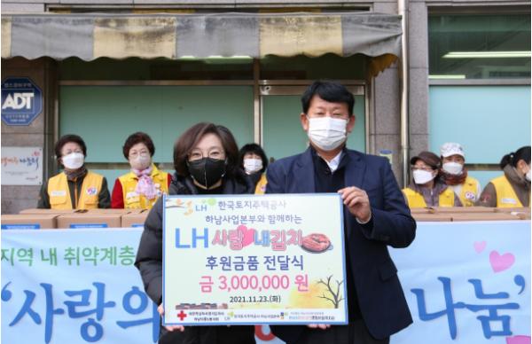 [한국뉴스타임=명기자] LH한국토지주택공사 하남사업본부(본부장 유석태)는 하남시미사강변종합사회복지관(관장 조혜연)에 후원금 300만원을 전달하며 ‘LH사랑 내김치’ 사업을 함께 진행하여 관내 취약계층 120가구에 사랑이 담긴 김장김치를 전달하였다.