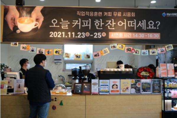 [한국뉴스타임=명기자] 하남시장애인복지관에서는 2021년 11월 23일, 25일 양일간 복지관 1층 나누美카페에서 직업적응훈련생인 예비 바리스타 7명의 재능기부로 무료 커피시음회를 진행하였다.