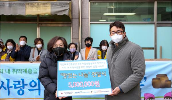 [한국뉴스타임=명기자] 국민체육진흥공단 경주사업총괄본부(본부장 김성택)는 겨울철 결식 우려가 있는 지역 내 취약계층에 김장김치를 전달해 달라며 하남시미사강변종합사회복지관(관장 조혜연)에 500만원을 전달하였다.