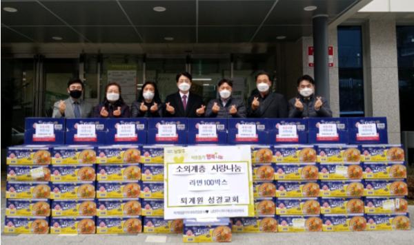 [한국뉴스타임=명기자] 남양주시 퇴계원읍에 위치한 퇴계원 성결교회는 지난 26일 읍사무소 및 교회 관계자 약 10여 명이 참여한 가운데 퇴계원읍사무소에서 라면 100박스 나눔 행사를 가졌다.
