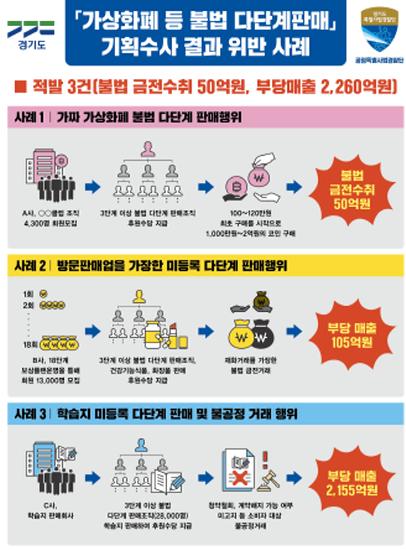 가상화폐 및 그 외 생필품, 건강식품 등에 대한 불법 다단계판매와 관련 피해는 경기도청 홈페이지, 카톡플러스친구(경기도공정특별사법경찰단), 경기도콜센터를 통해 신고가 가능하다.