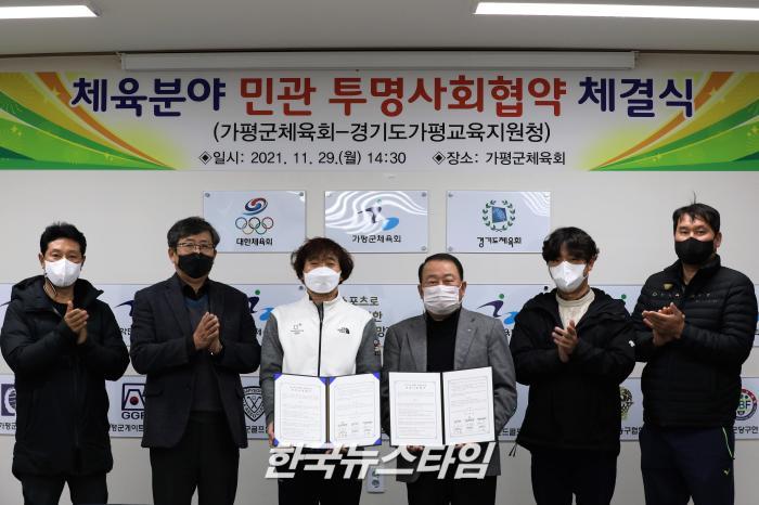 [한국뉴스타임=이명수기자] 29일 경기도 가평교육지원청과 가평군체육회는 가평군체육회에서 ‘체육분야 가평 민관 투명사회협약’을 체결하였다.