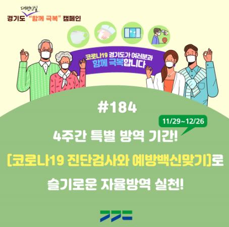30일 0시 기준, 경기도민 가운데 코로나19 예방접종을 완료한 사람은 총 1,073만8,317명으로 경기도 인구 대비 80.6%에 해당한다. 추가 접종자는 75만7,886명으로, 요양병원·요양시설 입소자·종사자 대상 추가접종은 29일 16시 기준, 대상자 11만9,040명 중 10만6,952명이 접종을 완료해 접종률은 89.8%다. 60세 이상 고령층 접종자는 30일 0시 기준 도내 대상자 208만8,778명 중 28만4,684명이 추가접종을 완료해 접종률은 13.6%다.