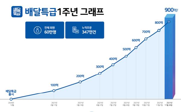 경기도주식회사는 배달특급 출시 1주년을 맞이한 1일 누적 거래액 900억 원을 돌파했다고 밝혔다. 지난해 12월 1일 화성·오산·파주 3개 지역에서 시범운영을 시작한 배달특급은 현재 도내 30개 지자체로 서비스 권역을 확대하며 민간배달앱의 훌륭한 대안제로 존재감을 과시하고 있다.