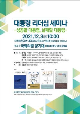 더불어민주당 소속 양기대 국회의원(경기광명을)은 3일 오전 10시 국회의원회관 대회의실에서 ‘성공할 대통령, 실패할 대통령’을 부제로 하는 ‘대통령 리더십 세미나’를 개최한다고 1일 밝혔다.