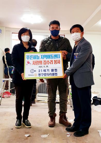 이번 집수리 봉사활동은 수택 E구역 재개발로 ‘푸른하늘 지역아동센터’가 이전하게 될 장소의 아동 돌봄 환경 개선을 위하여 실시한 것으로, 21세기클럽 한재명 회장 등 13명, 동구로타리클럽 YB모임 회원 1명의 재능 봉사로 9일 만에 집수리를 완료했다.