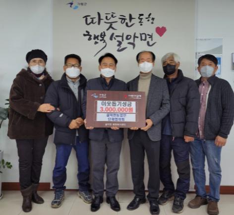 설악면 농업인단체협의회는 ▲농업인단체협의회 최인혁 회장과 회원 108만원 ▲농촌지도자회 손용석 회장과 회원 50만원 ▲농업경영인회 이기철 회장과 회원 20만원 ▲한우축산계 이성우 회장과 회원 20만원 ▲생활개선회 이정분 회장과 회원 10만원 ▲여성농업인회 곽동희 회장과 회원 10만원 ▲쌀연구회 백승남 회장과 회원 10만원 ▲사과작목반 이성세 회장과 회원 10만원 ▲유명산 포도작목반 손용석 회장과 회원 10만원 ▲시설채소작목반 박상견 회장과 회원 12만원 ▲오디뽕작목반 이강언 회장과 회원 10만원 ▲찰옥수수작목반 강근원 회장과 회원 10만원 ▲양계회 권영돈 회장과 회원 16만원 ▲한봉작목반 권오선 회장과 회원 10만원 등 회원들이 십시일반 모은 성금으로 기탁했다