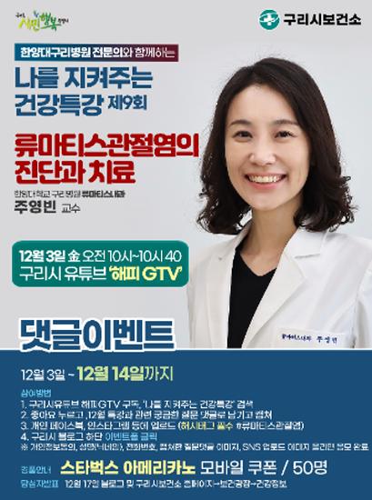 안승남 구리시장은 “이번 12월 건강특강인 류마티스 관절염 진단과 치료를 많은 시민분들이 시청하시어 건강한 겨울나기를 하셨으면 하는 바람이다.”라고 전했다.