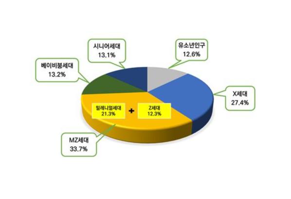 지난해 경기도 인구 1,331만5,000여 명을 기준으로 ▲Z세대 12.3% ▲밀레니얼 세대 21.3% ▲X세대 27.4% ▲베이비붐 세대 13.2% ▲시니어시대 13.1% ▲유소년 12.6% 등의 비중이다.
