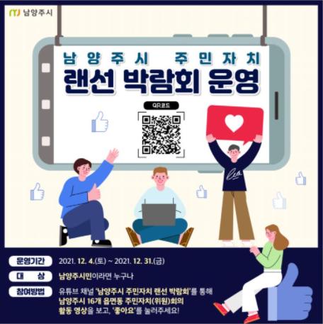 [한국뉴스타임=편집국] 남양주시는 관내 16개 주민자치(위원)회의 활동을 전 시민과 공유하기 위해 12월 4일부터 31일까지 「주민자치 랜선 박람회」를 실시한다.