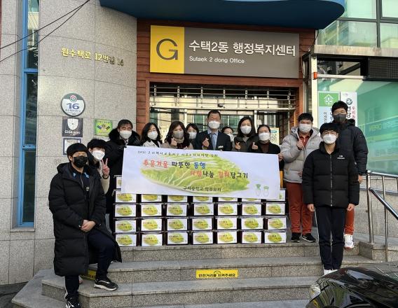 구리중학교 학부모회에서는 수택2동 저소득가정이 겨울철을 잘 지낼 수 있도록, 학생들과 함께 이틀간 김장재료와 배추를 구입해 정성스럽게 김치를 담궜다.