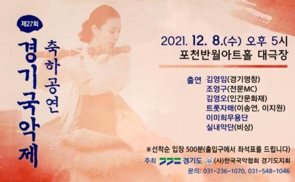 12월 7일과 8일 포천반월아트홀에서 치러지는 경기국악제는 7일 민요, 전통무용, 기악 등 3개 부문에 대한 명인부 예선을 시작으로 일반부와 학생부 영상심사를 거쳐, 8일 명인부 본선과 결선 대면심사 후 오후 5시부터 축하공연이 펼쳐진다.