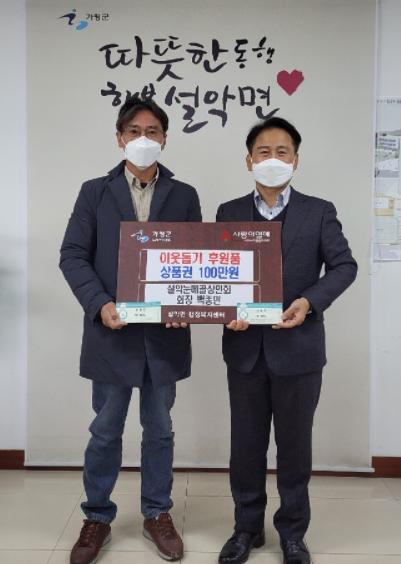 [한국뉴스타임=편집국] 설악면 눈메골 상인회장 백종민은 지난 2일 설악면행정복지센터를 방문하여 연말연시를 맞아 취약계층 등 어려움을 겪는 이웃에 전달해 달라며 설악눈메골상인회 1만원 상품권 100장을 기탁했다.