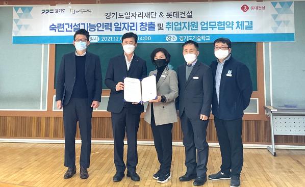 협약 주요내용은 ▲기업맞춤형 직영과정 훈련을 위한 강사풀 지원 ▲경기도일자리재단 숙련건설기능인력 교육훈련생 현장실습 및 취업지원 ▲우수인력 롯데건설 우선 채용 보장 등이다.