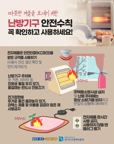 남양주소방서 관계자는 “각 가정에서는 화재위험이 큰 난방용품의 올바른 사용과 안전수칙을 준수해 주길 바란다.”라며, “더불어 화재 시 피해를 최소화할 수 있도록 각 가정에 주택용 소방시설을 설치하자.”라고 전했다.
