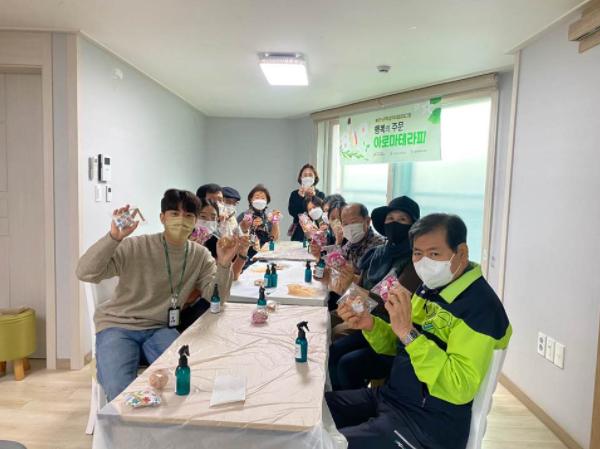 이날 프로그램은 입주자의 자립을 돕는 마을활동가들과 함께 케어안심주택 입주자들이 아로마테라피 전문 강사의 교육을 받으며 아로마 향기주머니, 천연 주물럭비누, 천연 룸스프레이를 만들며 심신 건강을 증진시키고자 마련됐다.