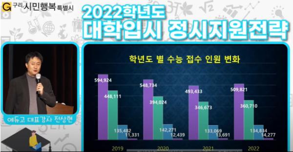 한편, 구리시는 매년 대학입시 일정에 맞추어 관내 학생들과 학부모님들을 대상으로 진학정보 설명회를 진행하고 있으며, 올해 입시설명회 영상은 누구나 시청할 수 있도록 2022년 1월 말까지 구리시 유튜브 공식 채널인 ‘해피GTV’를 통해 공개된다.