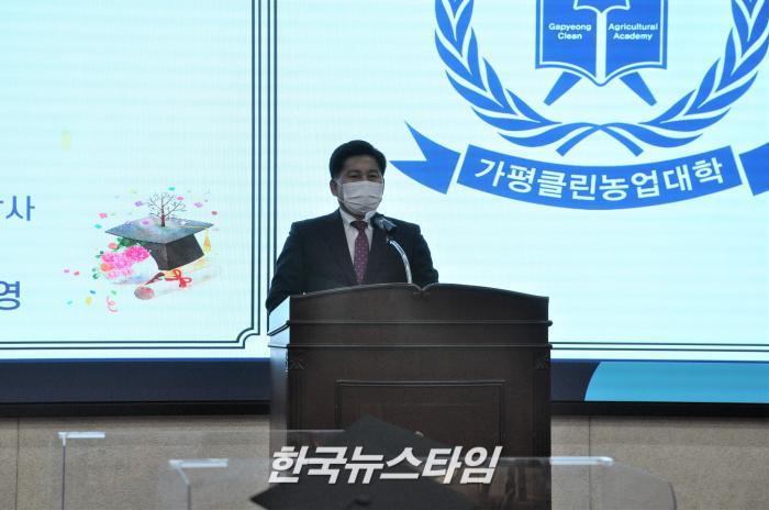 가평군수이자, 클린농업대학 학장이신 김성기 군수는 “코로나19라는 어려운 상황 속에서도 1년 동안 열정을 다해 학업에 전념한 107명의 졸업생들에게 진심으로 축하드리고, 앞으로 가평농업을 이끌어 갈 유능한 인재로 성장하여, 가평농업 발전에 기여해 줄 것”을 당부했다.