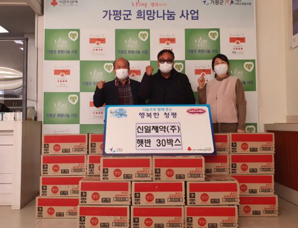 [한국뉴스타임=편집국] 지난 12월 14일, ㈜신일제약 청평면 복지대상자를 위해 청평면사무소를 방문하여 햇반 30박스를 기탁했다.