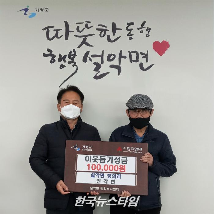 [한국뉴스타임=편집국] 설악면 창의리 민각현님은 지난 13일 월요일 설악면행정복지센터를 방문하여 성금 10만원을 기탁하였다.