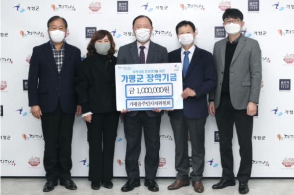 [한국뉴스타임=편집국] 가평읍 주민자치위원회는 15일 위원들과 군수실을 방문하여 지역사회 인재양성을 위한 장학기금 1백만원을 기탁하였다.